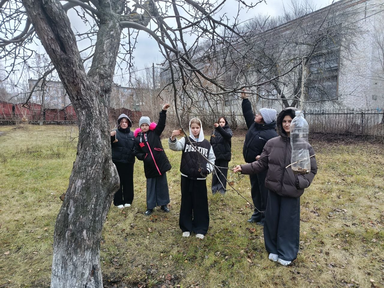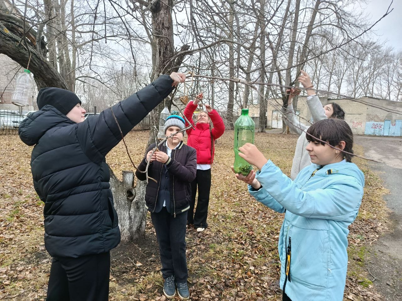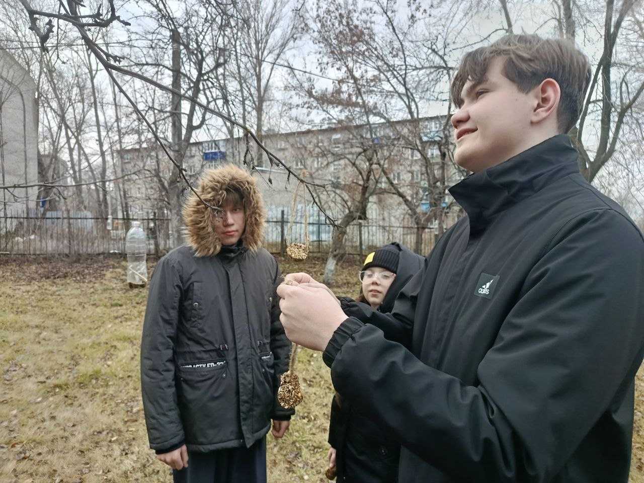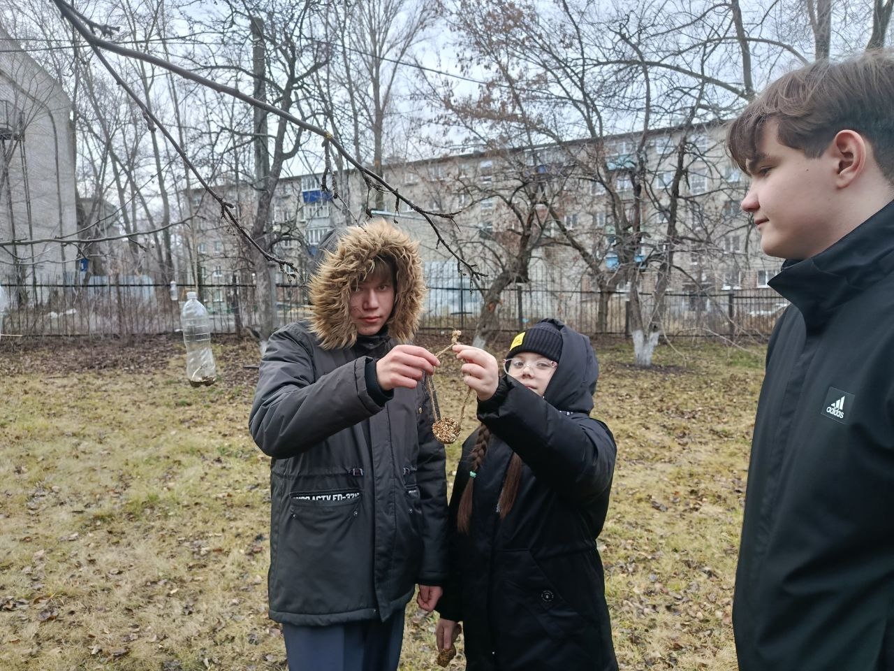 На занятии школьного лесничества «Дубравушка» обучающиеся Центра ЕОиЭВ «Экокампус» Дворца творчества детей и молодёжи, учащиеся 6б класса МБОУ СШ №48 имени Героя России Д.С.Кожемякина под чутким руководством эколидеров Ивановой Ирины (10а), Копачевой Мирославы (9а), Пузова Матвея (10а) и Соловьева Артема (10а) развесили на яблоневых деревьях школьного сада лакомство для зимующих птиц — печенье, сделанное своими руками.